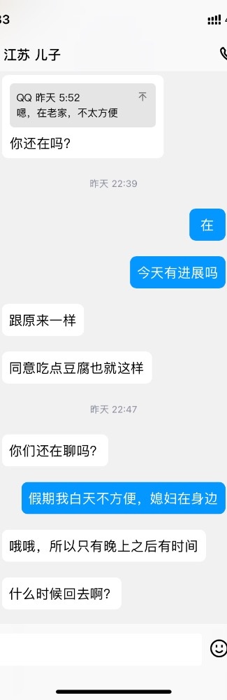 我思考了半天需不需要发出和儿子的这些聊天记录,发出来不是为了让大家批评他,是让大家看到真实的状态,了解儿子平时交际水平,更能了解我调教他妈妈的难度。